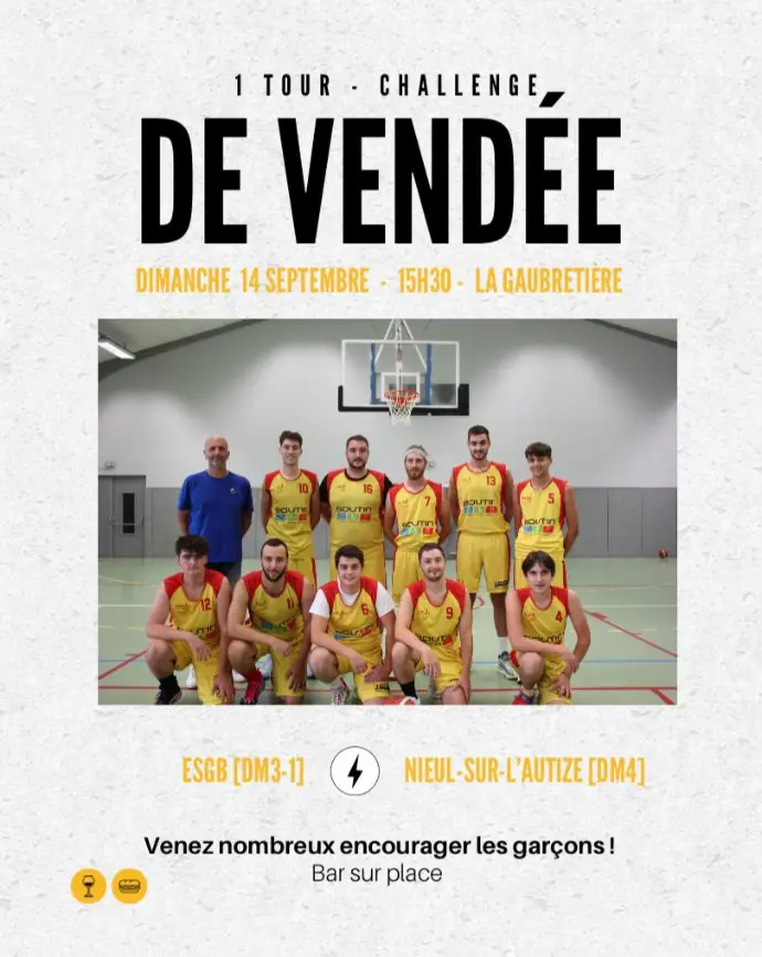 Ce dimanche 14 septembre, notre équipe DM3-1 recevra Nieul-sur-l'autize (DM4) pour jouer le 1er tour de Challenge de Vendée 🏀.